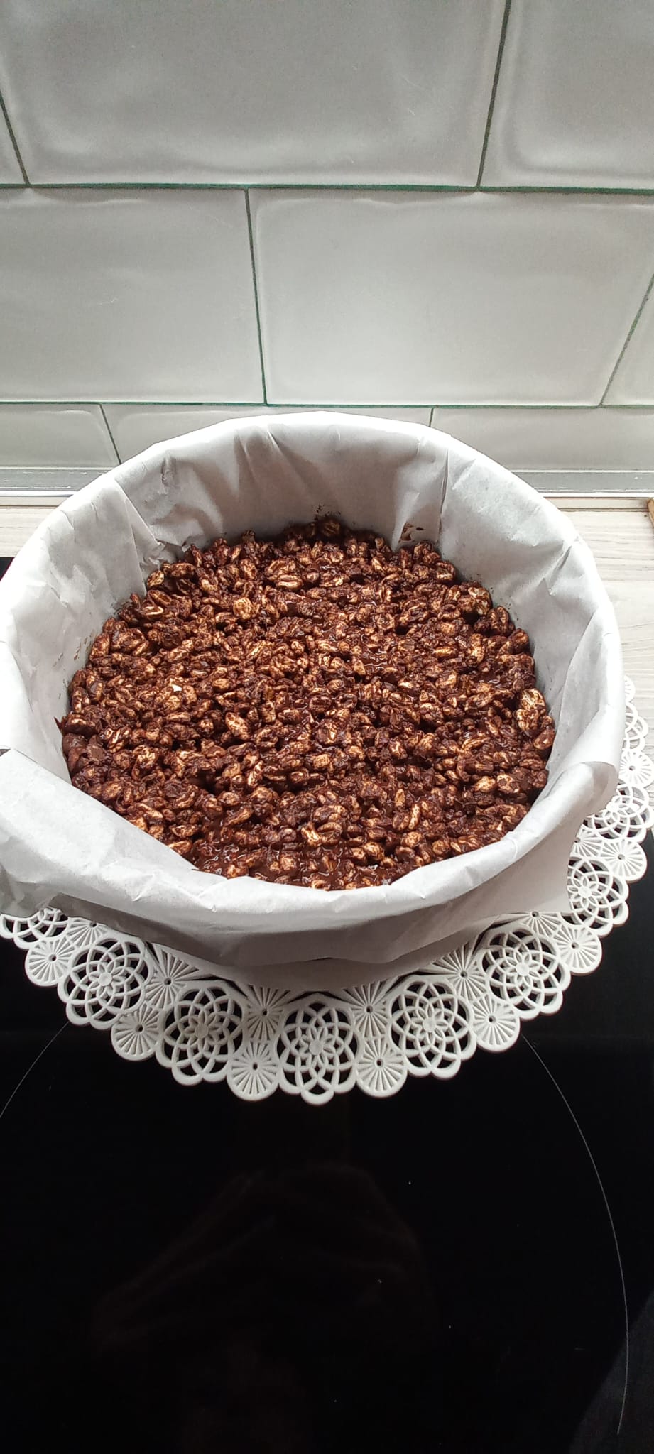 Adagiare il farro soffiato al cioccolato sulla base e livellare per bene.