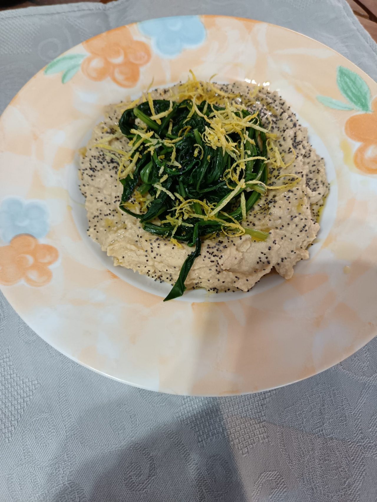 In un piatto servire l’hummus di ceci con la cicoria e decorare con zeste di limone e semi di chia.